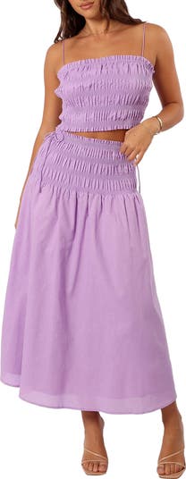 Pretty shirring ripples over a coordinated set featuring a ruffle-traced cropped camisole and dainty ties on the accompanying skirt.