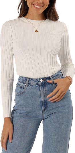 Love to layer in this close-fitting top shaped by wide ribbing and punctuated with curly lettuce trim.