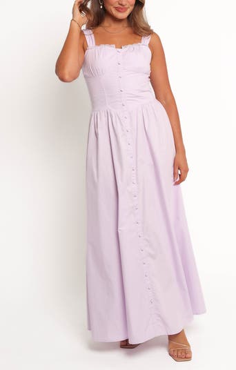 A sweet summery maxi is made with lovely lacy trim peeking past the neckline and finished with a flared skirt that sways with every step. Back smocking adds shape and easy movement to this charming look.
