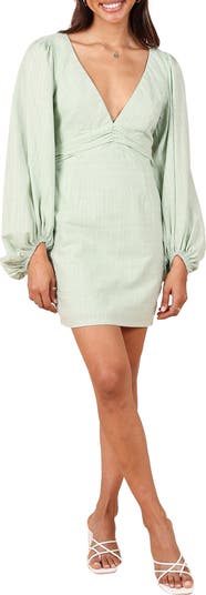 Jacquard stripes create a subtle texture atop this cotton minidress with voluminous balloon sleeves and a plunging V-neckline.