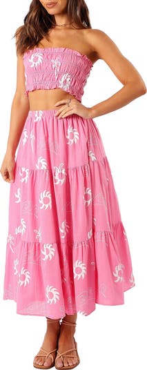 Sweeten your vibe in this printed set that includes a smocked tube top and a flouncy tiered skirt.