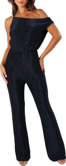 A sparkly, party-ready design adds to the glam of this shoulder-baring jumpsuit finished with fabulously flared legs.