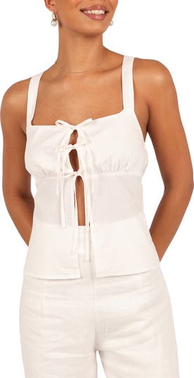 Slender ties fasten at the front of this dainty Empire-waist tank top that is made from a crisp and airy blend of cotton and linen which is great for the sunnier seasons.
