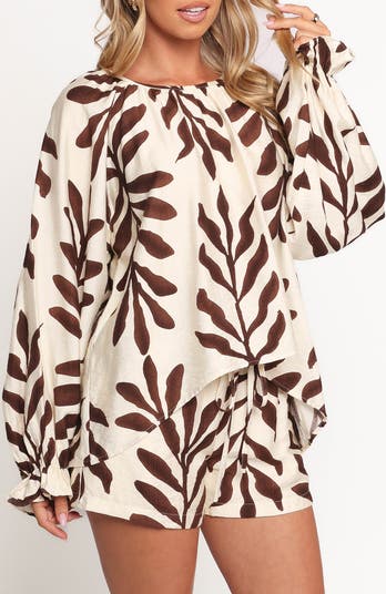 Voluminous long sleeves and a flowy silhouette bring summery vibes to this lightweight top covered in an artsy palm-frond print.