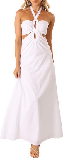 Daring waist and chest cutouts lead up to the intersecting halter straps of this resort-ready maxi dress cut from fresh, breathable cotton.