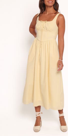 A corset-inspired bodice gives way to a swishy skirt in this midi dress cut from a cool cotton blend and perfect for your next elevated brunch look.
