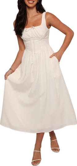 A corset-inspired bodice gives way to a swishy skirt in this midi dress cut from a cool cotton blend and perfect for your next elevated brunch look.