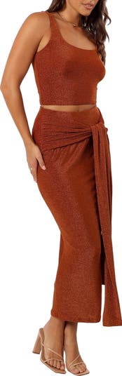 Glitter in the moonlight in this trim set featuring a cropped tank paired with a skirt that has a tie at the hip you can wear in multiple ways.