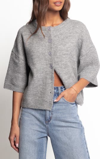 Dropped shoulders and a boxy silhouette bring laid-back comfort to this cardigan knit with elbow-length sleeves.