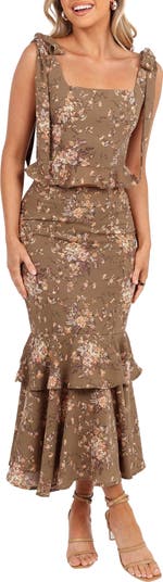 A fluttery peplum on the cropped tank stylishly corresponds with the tiered-ruffle skirt of this chic set that's perfect for weekend outings.