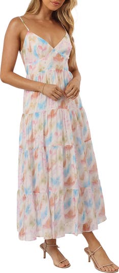 Floaty tiered ruffles romance this sleeveless maxi romanced by a mesmerizing watercolor print.