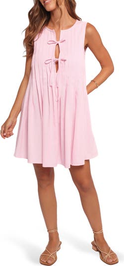 Pretty pintucks frame a breezy, easygoing minidress fashioned with a plunge neck that's secured with a pair of ties.