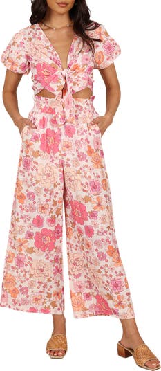 Channel charming retro style in this two-piece set featuring a perfectly cropped top and wide-leg pants in a vibrant floral pattern.