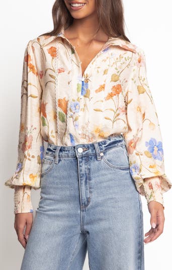 Enchanting blooms romance this crinkled satin shirt trimmed with lovely lace and framed by billowed sleeves with smocked cuffs.