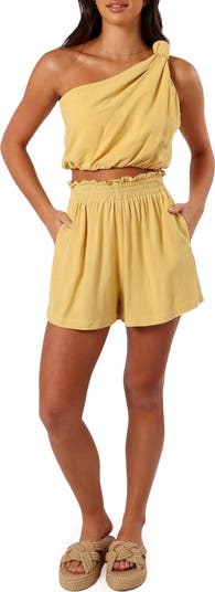 Make vacay packing a breeze with this lightweight linen set featuring a cropped one-shoulder tank and matching shorts that multiply your outfit options as you wear them together and pair them with more separates.