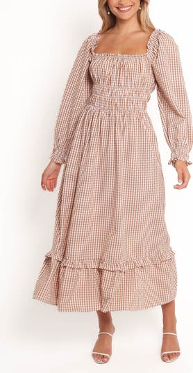 Shirred accents add texture and shape to this breezy checked maxi made with billowed sleeves and a frilled hem for graceful movement.