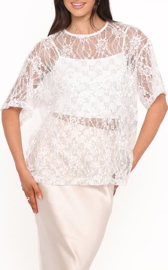 Check-patterned sequins add a bit of glitz and glam to this oversized sheer top made from romantic floral lace.