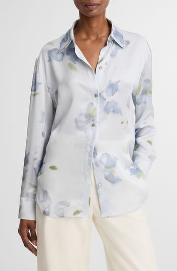 This button-up silk blouse is defined by a lustrous finish and soft watercolor floral motif. Designed with a clean point collar and plain front, it delivers a luxe, refined look with effortless elegance.