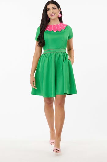 This adorable flare dress is crafted in a woven fabric accented with a collar set in the shape of petals around the neck. Complete with short sleeves, back zipper, and side pockets!