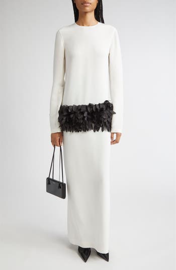 TOTEME tilts its trademark Scandi minimalism into nocturnal territory with this columnar wool-silk dress wrapped in scores of floaty fabric petals, mimicking the gentle sway of feathers.