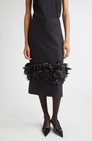 This wool-and-silk midi skirt amplifies movement through an intricately layered band of lightweight petals engineered to sway and echo the soft percussion of feathers. A smooth waistband and calibrated seamwork maintain a clean line so the petal layer becomes the kinetic focus.