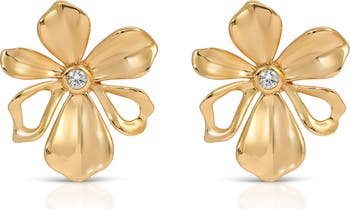 Whether you're going for a stunning bridal look or want to add a gleaming statement to your sunny-day style, these sculptural flower earrings plated in 18-karat gold are a can't-go-wrong choice. Sparkling cubic zirconia light up the centers for an extra element of shine.