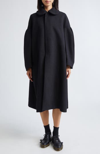 Exaggerated proportions, sculptural volume—Rei Kawakubo continues her exploration of each in this cocooning Japanese-crepe coat, where dropped shoulders and rounded sleeves give way to a swingy A-line shape. The prim-meets-playful Peter Pan collar sweetens the look.
