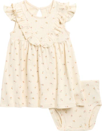 Your babe will be picture-perfect in a matched set that includes a ruffled dress paired with sweet bloomers, all made from organic cotton that's gentle on newborn skin.