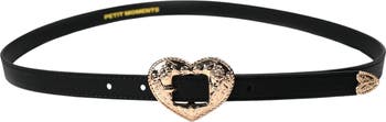 A flower-detailed heart buckle centers this belt with sweet shine.