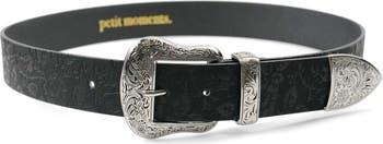 Botanic debossing enhances the texture of this faux-leather belt centered with engraved hardware.