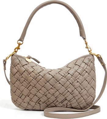 Handwoven leather distinguishes a slightly unstructured bag fashioned with a detachable top handle and crossbody strap for styling versatility.