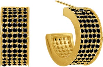 Rows of pavé black crystals bring striking sparkle to these thick huggie hoop earrings finished with brushed edges.