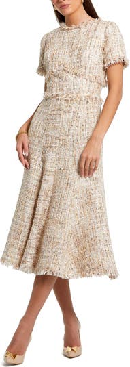 Charming bouclé A-line dress with a high neckline, short sleeves, and playful frill detailing for a polished look perfect for daytime events.