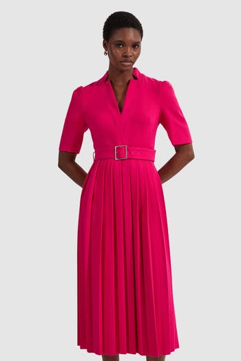 Sculpted V-neck midi that cinches the waist, cascading into fluid pleats for a striking occasion silhouette.