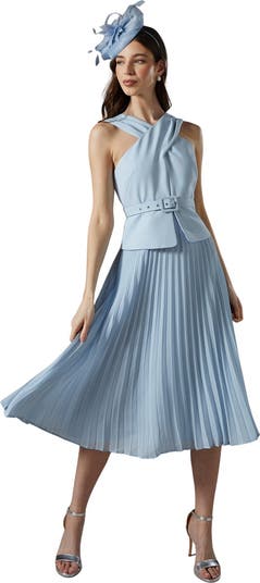 Stunning midi dress with elegant pleats and a flattering cross-over design, perfect for stylish occasionwear or a chic day out.