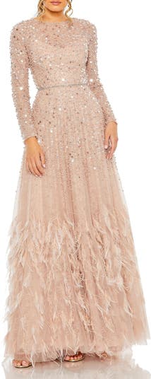 Elegant and luxurious, this embellished gown features long sheer sleeves, a beaded waist, and a dramatic feathered skirt for unforgettable formal occasions.