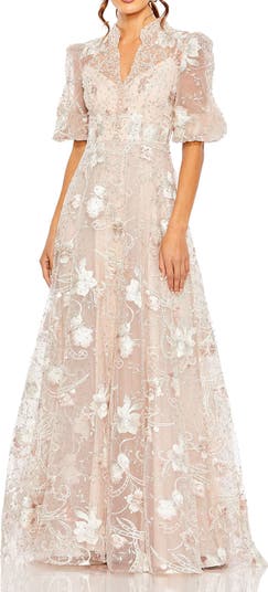 Petite Embroidered Queen Anne Puff Sleeve A Line Gown