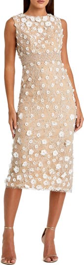 Elegant sleeveless midi dress with an embellished lace overlay, 3D floral detailing, and a hand-beaded waist for a refined special-occasion look.