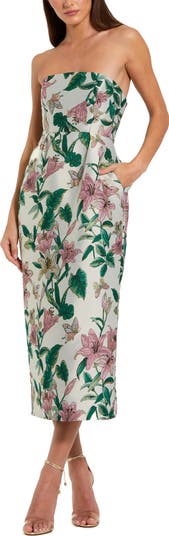Elegant strapless brocade midi dress in a tropical floral print, finished with a sleek silhouette and pockets for polished daytime-to-evening style.