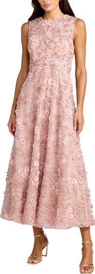 Petite floral embroidered midi dress with a high neckline and sleeveless design, featuring delicate lace and appliqué detailing for weddings and special occasions.