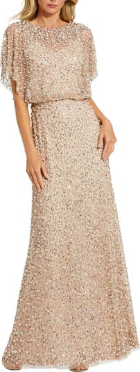Embellished mesh gown with an illusion neckline, blouson bodice, and pearl-accented beading over a sleek column silhouette.