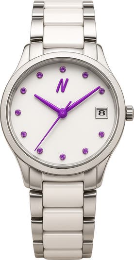 - 3-hand quartz movement Case size: 34mm Stainless steel case and ceramic bracelet Mineral-hardlex crystal Water resistance: 3 ATM Dial color: White Brilliant/Striking Purple/Hushed Silver Bracelet finish: Hushed Silver/White Brilliant Ceramic bracelet with push deployant clasp Limited production Manufacturer’s 60-month warranty