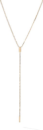 Gleaming tags flank the drop of this petite lariat necklace shaped from flat mariner links of 14-karat gold.