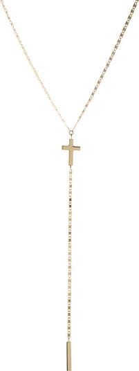 A small cross pendant centers this Y-necklace glinting in 14-karat gold.