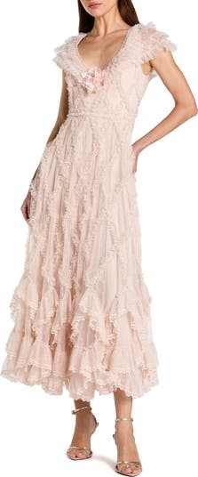 Romantic ruffle midi dress with deep V-neckline, flutter sleeves, floral applique detail, and tiered lace skirt—perfect for weddings, garden parties, and special occasions.