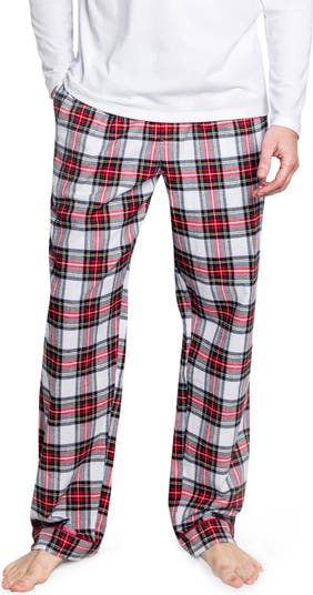 A classic Scottish plaid adds timeless appeal to cozy pajama bottoms made from lightweight cotton twill and accented with vibrant red piping.