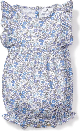 A French-inspired floral print covers this ruffly romper that's brushed for softness and finished with mother-of-pearl buttons at the back.