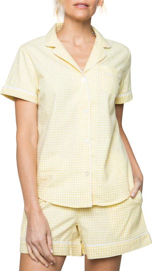 Feel cool and comfy in these woven cotton pajamas softened with gingham checks and tailored with notched lapels, smooth piping and convenient pockets.