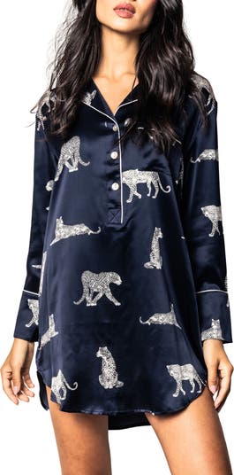 Contrast piping outlines this classic menswear-inspired nightshirt cut from luxurious silk spotted all over with stalking panthers.