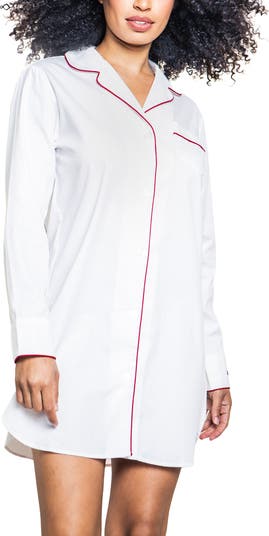 Vibrant piping outlines this classic menswear-inspired nightshirt styled to flatter the feminine figure with a V-neckline and shirttail hem.